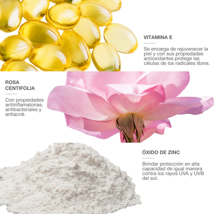 Dióxido de titanio: Excelente protector solar, Protege la piel de la radiación UVB y medianamente UVA y, cuida la piel sensible y propensas al enrojecimiento debido a que es suave, ideal para usar alrededor de los ojos, ya que no es irritante..