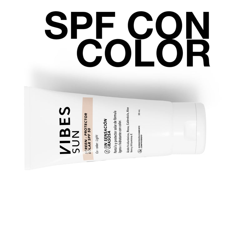 Un protector solar de amplio espectro que también actúa como pantalla solar. Protege tanto de las luces físicas (sol) como de las químicas (pantallas, celulares, luces artificiales). Además, está enriquecido con activos que lo convierten en un tratamiento para la piel.