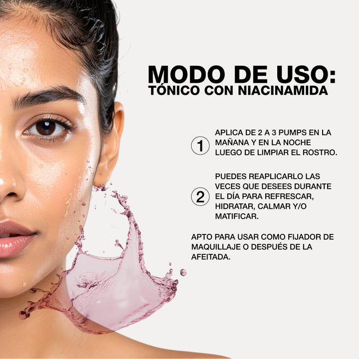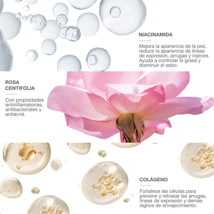Hidratante, tonificador, refrescante dermatológicamente comprobado. Esta mezcla concentrada de Rosa Centifolia y Niacinamida, combinada con Aloe Vera, Colágeno, Elastina, Manzanilla y Vitamina E, equilibrados crean un tónico que despierta y protege la piel, mejorando la luminosidad, previniendo su envejecimiento, las imperfecciones y regulando la grasa.