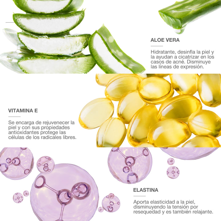 Aloe Vera: Un activo natural con propiedad hidratantes que desinflaman la piel y la ayudan a cicatrizar en los casos de acné o heridas superficiales. Sus propiedades anti-estrías son ideales para disminuir las líneas de expresión, aportando vitalidad.